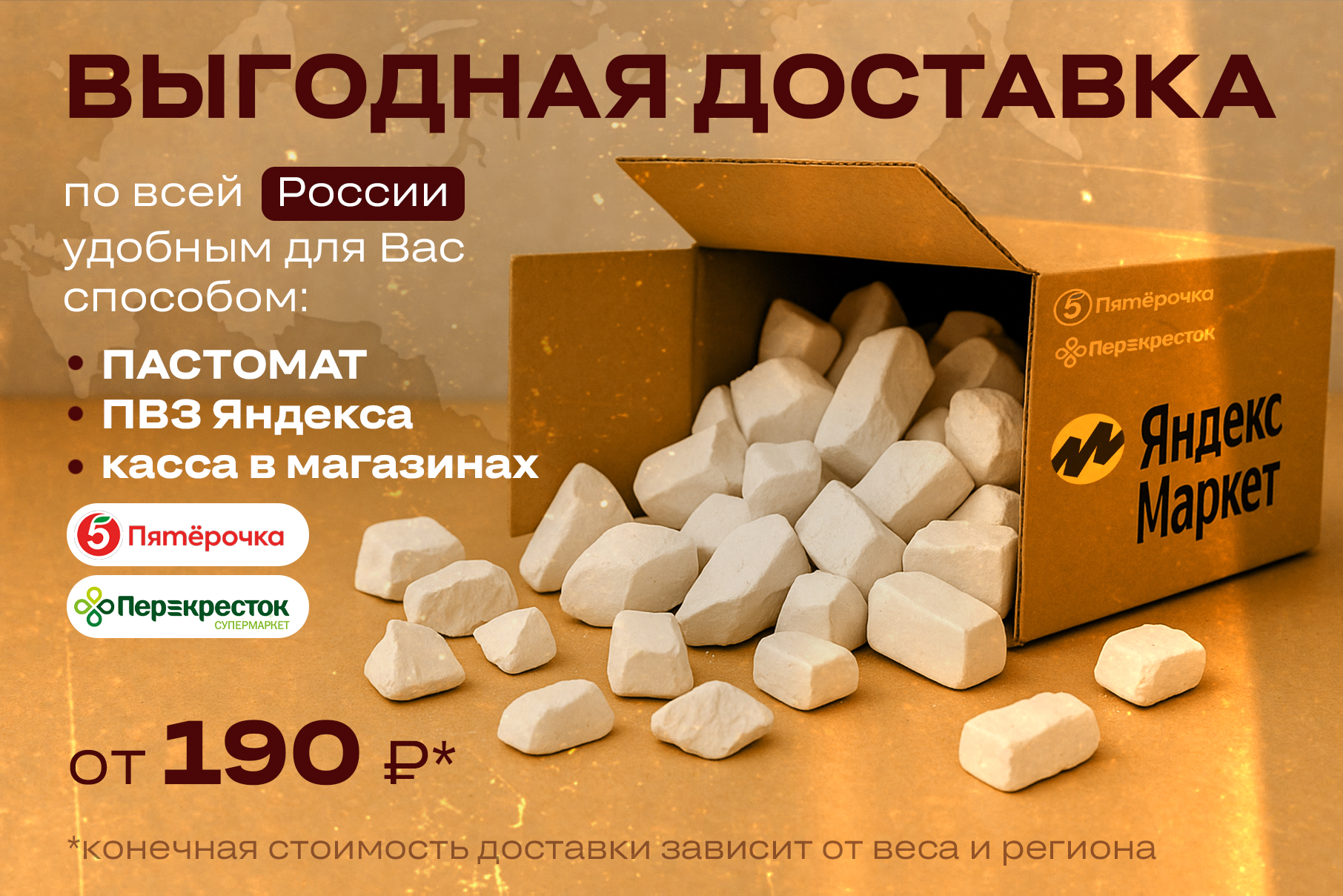 Все это добывается в чистейших местах России и СНГ и напрямую доставляется с месторождений к нам. Мы создали идеальные условия для сохранения полезных веществ в каждом куске, грануле, порошке.
